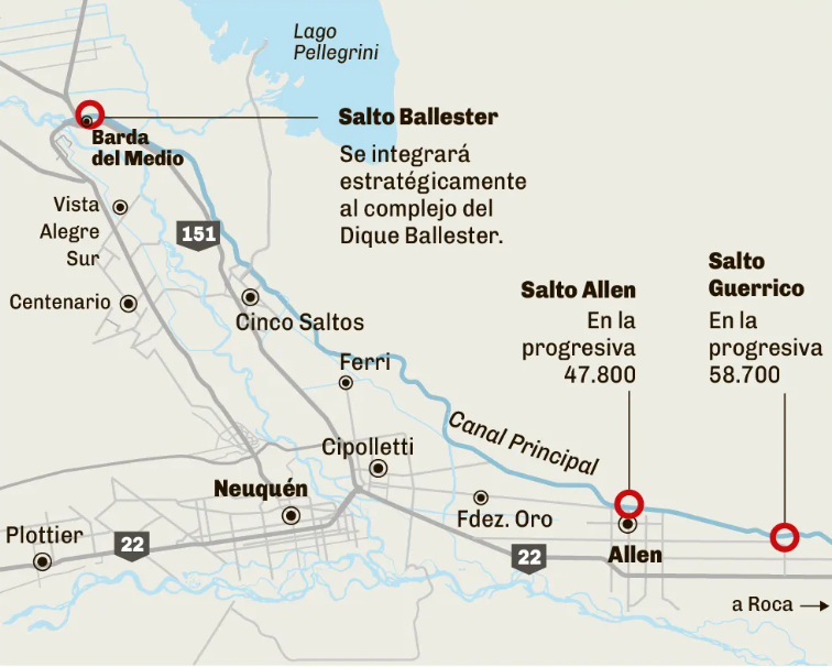 Los proyectos estarán ubicados en tres puntos: Salto Guerrico (progresiva 58.700), Salto Allen (47.800) y Salto Ballester, este último integrado al sistema del histórico dique homónimo. Las centrales serán del tipo “de paso”, lo que implica que no requerirán embalses y respetarán el curso natural del agua.