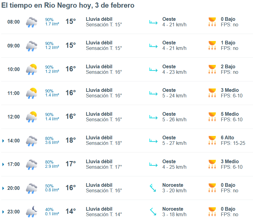 De acuerdo al parte del Servicio Meteorológico Nacional, el clima en esta ciudad de Río Negro se presentaría sin lluvias, y los vientos del sudoeste correrán a una velocidad de entre 32 y 41 kilómetros por hora. La humedad sería del 55 por ciento, y la visibilidad sería buena.