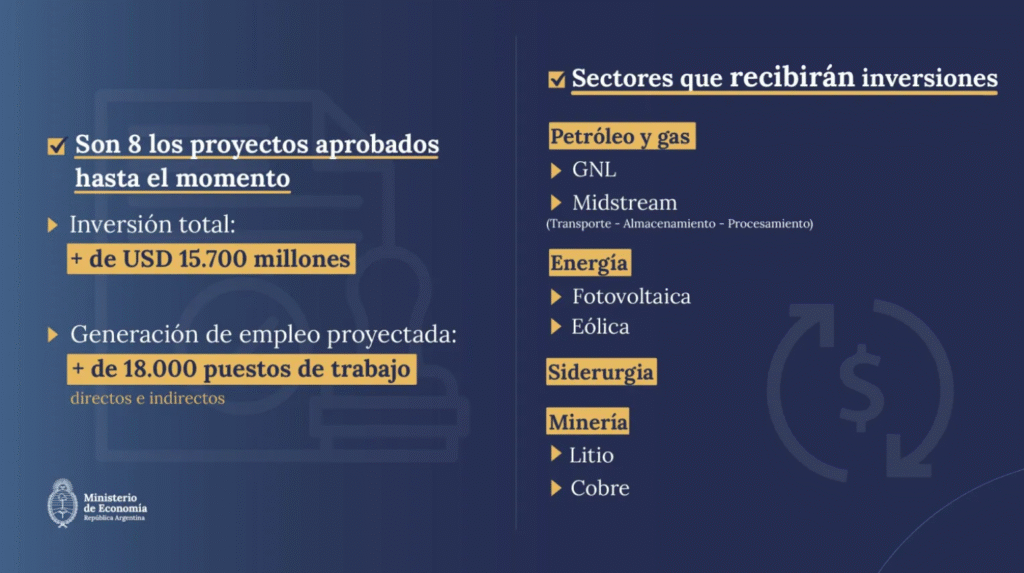 El Ministerio de Economía detalló que el RIGI busca impulsar inversiones a gran escala, otorgando seguridad jurídica, previsibilidad y beneficios fiscales a proyectos considerados estructurales para el crecimiento del país.