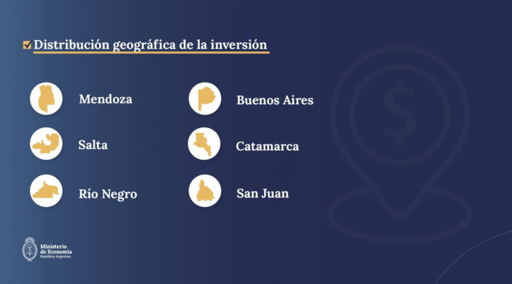 Según se informó oficialmente, las iniciativas abarcan sectores estratégicos como petróleo y gas, energía, minería y siderurgia, con presencia en seis provincias: Río Negro, Buenos Aires, Catamarca, Mendoza, Salta y San Juan.