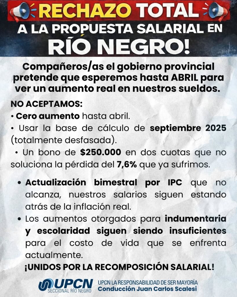 La UPCN Seccional Río Negro resolvió rechazar por unanimidad la propuesta salarial del Ejecutivo provincial tras la reunión del Consejo de la Función Pública. Desde la conducción sindical señalaron que la oferta “sigue siendo deudora de la dignidad estatal” y no responde al mandato de las bases.