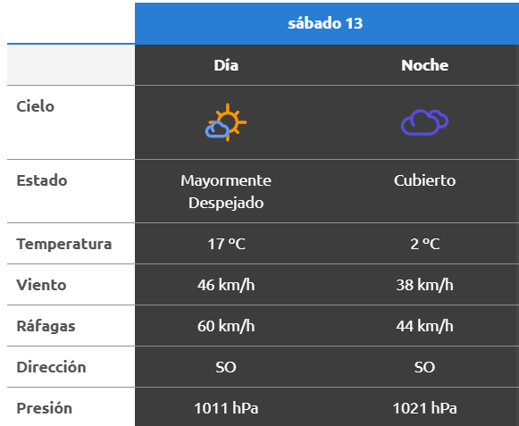 • Mañana: cielo parcialmente nublado, 13°C, viento leve a moderado con ráfagas que también rondarán los 50 km/h.