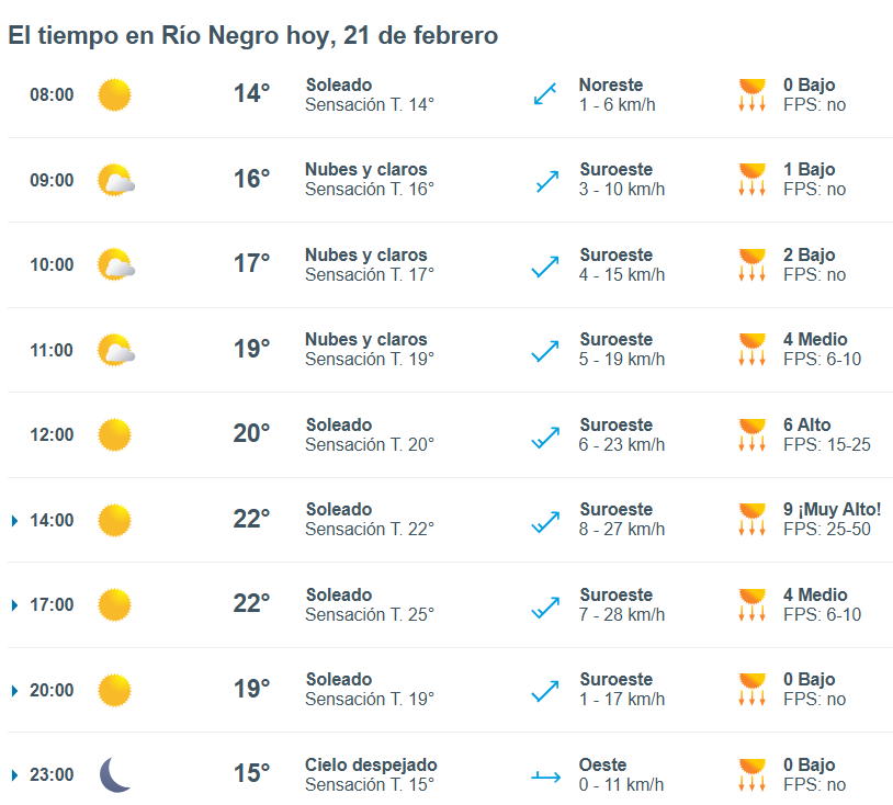 El pronóstico del tiempo para la ciudad de Río Negro, indica que hoy 21 de febrero el cielo estará ligeramente nublado por la mañana y la temperatura rondará entre 17 grados.