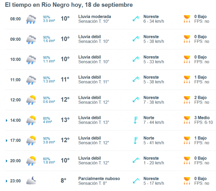 De acuerdo al parte del Servicio Meteorológico Nacional, el clima en esta ciudad de Río Negro presenta una probabilidad de lluvia de entre 40 y 70 por ciento, y los vientos del sudeste correrán a una velocidad de entre 13 y 22 kilómetros por hora. La humedad sería del 84 por ciento, y la visibilidad sería regular.