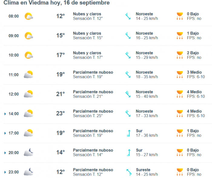 El pronóstico del tiempo para la ciudad de Viedma, indica que hoy 16 de septiembre el cielo estará con chaparrones por la mañana y la temperatura rondará entre 17 grados.