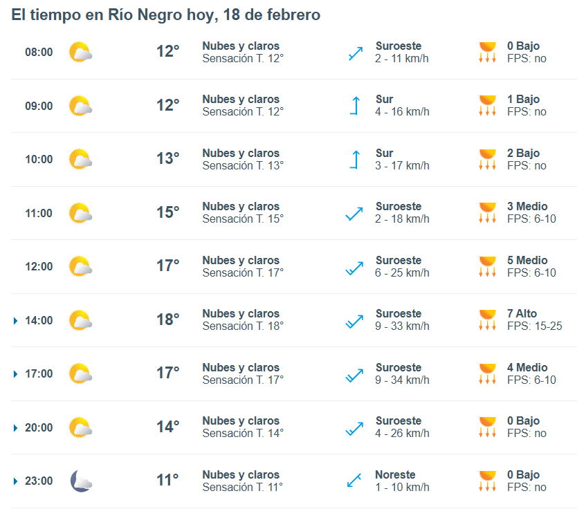 El pronóstico del tiempo para la ciudad de Río Negro, indica que hoy 18 de febrero el cielo estará parcialmente nublado por la mañana y la temperatura rondará entre 10 grados.