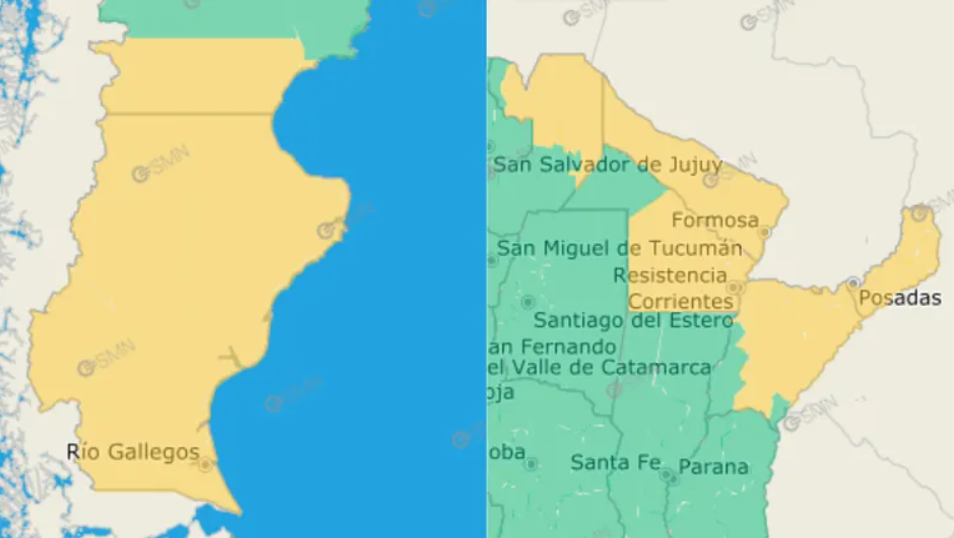 En el sur del país, específicamente en el sur de Chubut y en toda Santa Cruz, hay alerta por vientos del oeste con velocidades entre 40 y 60 km/h y ráfagas que podrían superar los 90 km/h.