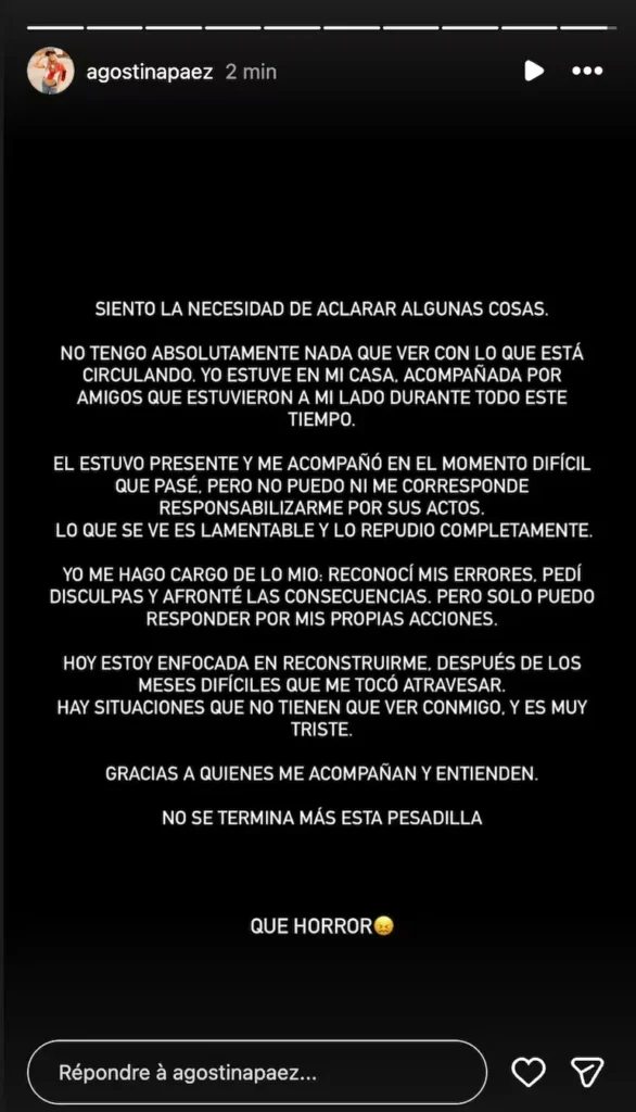 Por su parte, Agostina Páez tomó distancia de lo ocurrido y publicó un descargo en sus redes sociales. La abogada expresó su repudio a la actitud de su padre y remarcó que solo puede responsabilizarse por sus propias acciones. “Reconocí mis errores, pedí disculpas y afronté las consecuencias”, señaló.
