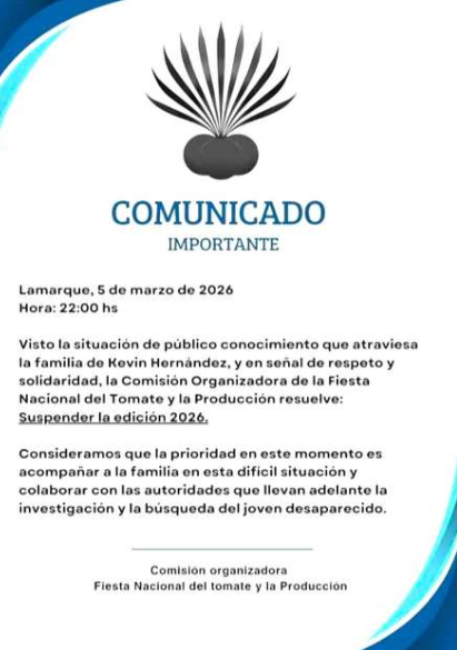 La ciudad de Lamarque vive momentos de profunda conmoción. La Comisión Organizadora de la Fiesta Nacional del Tomate y la Producción anunció la suspensión de la edición 2026, prevista para este mes, en señal de respeto y solidaridad con la familia de Kevin Hernández, el joven de 26 años desaparecido desde el 22 de febrero.