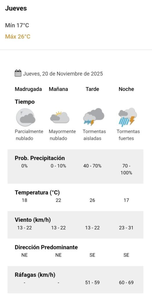 A la noche, el clima rondará los 17 grados, mientras que los vientos serán del sudeste y correrán a una velocidad de entre 23 y 31 kilómetros por hora. La probabilidad de lluvia estaría en el orden de entre 70 y 100 por ciento para esta franja del día.