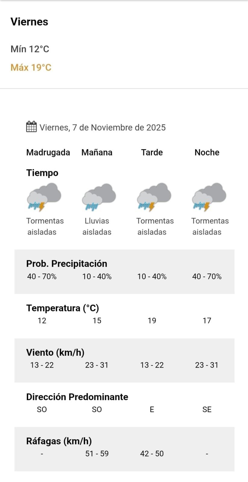 De acuerdo al parte del Servicio Meteorológico Nacional, el clima presenta una probabilidad de lluvia del 10 y 40 por ciento, y los vientos del sudoeste correrán a una velocidad de entre 23 y 31 kilómetros por hora. La humedad sería del 91 por ciento, y la visibilidad sería regular.