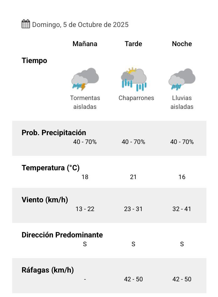 El parte del servicio meteorológico prevé que para después del mediodía el cielo estará con chaparrones y los vientos del sector sur tendrán velocidades estimadas entre 23 y 31 km/h. La temperatura pronosticada sería de 21 grados.