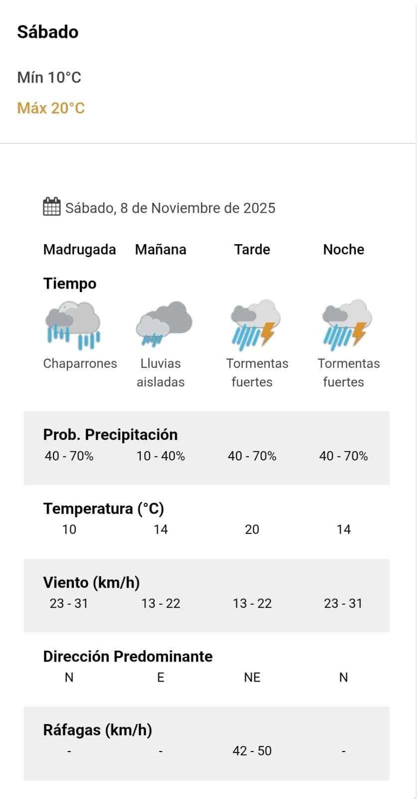 A la noche, el clima rondará los 14 grados, mientras que los vientos serán del norte y correrán a una velocidad de entre 23 y 31 kilómetros por hora. La probabilidad de lluvia estaría en el orden de entre 40 y 70 por ciento para esta franja del día.