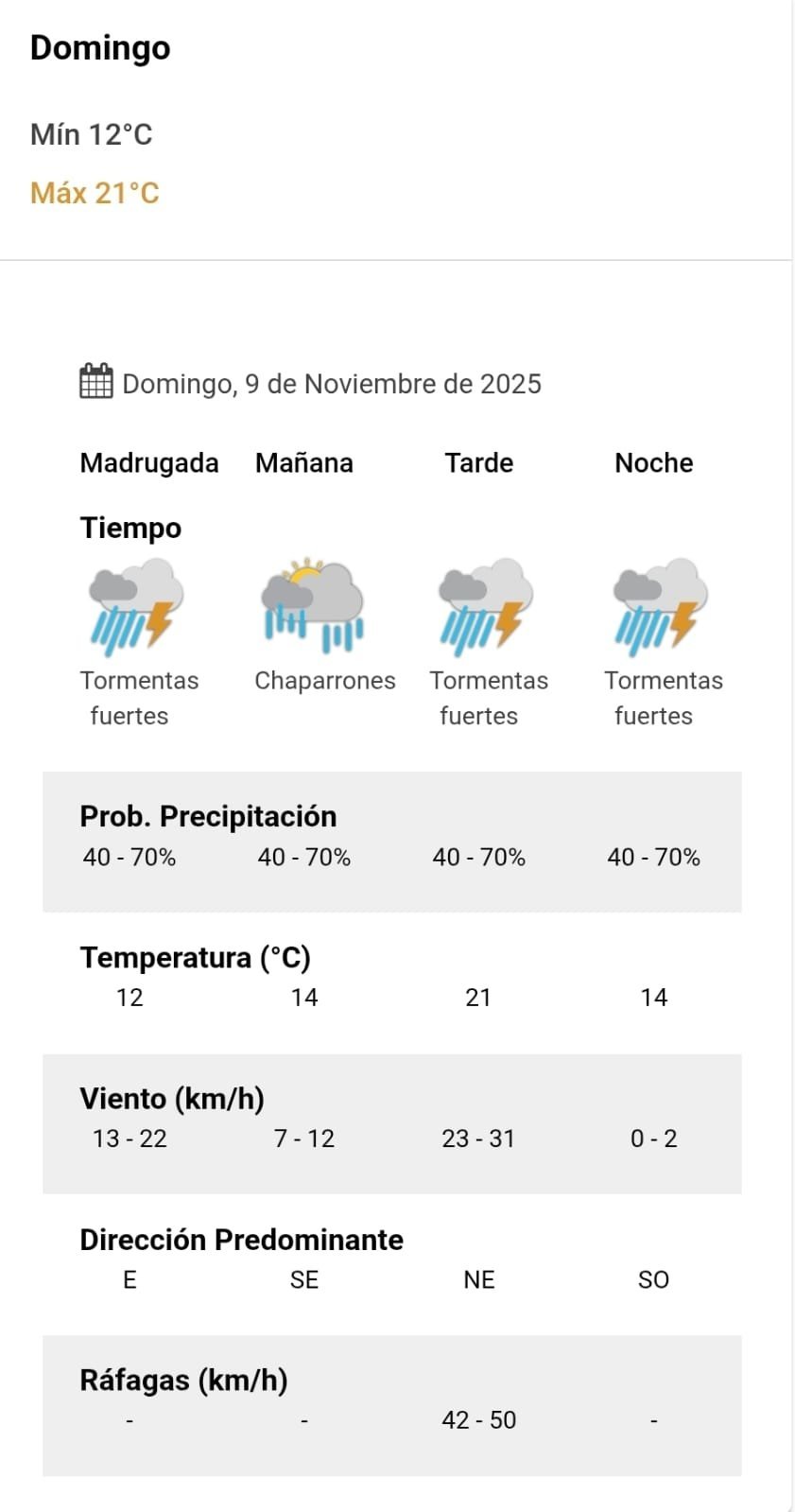 El parte del servicio meteorológico prevé que para después del mediodía el cielo estará con tormentas fuertes y los vientos del sector noreste tendrán velocidades estimadas de entre 23 y 31 km/h. La temperatura pronosticada sería de 21 grados.