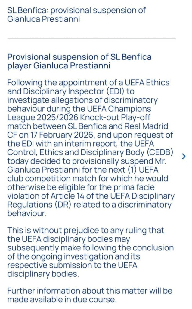 En su comunicado, la UEFA señaló que la sanción se aplica “para el próximo partido de competición de clubes” al que el futbolista hubiera sido elegible, por una presunta violación del Artículo 14 del Reglamento Disciplinario, que contempla conductas discriminatorias. Además, aclaró que la investigación sigue abierta y que podrían aplicarse castigos adicionales o multas.