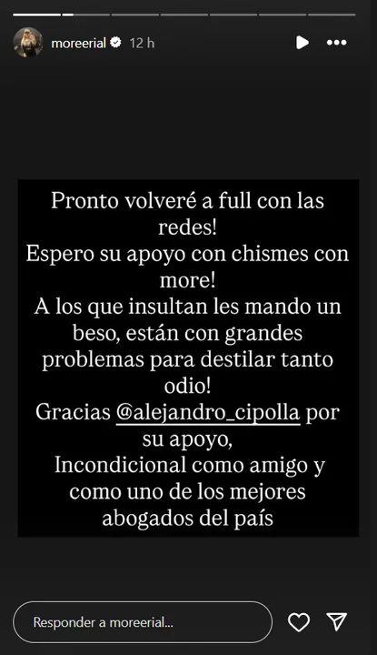 “Pronto volveré a full con las redes! Espero su apoyo con ‘Chismes con More’”, escribió en una historia de Instagram, dando a entender que retomará su contenido habitual en cuanto tenga la posibilidad. También hizo alusión a quienes la criticaron tras los últimos acontecimientos: “A los que insultan les mando un beso, están con grandes problemas para destilar tanto odio”, lanzó.
