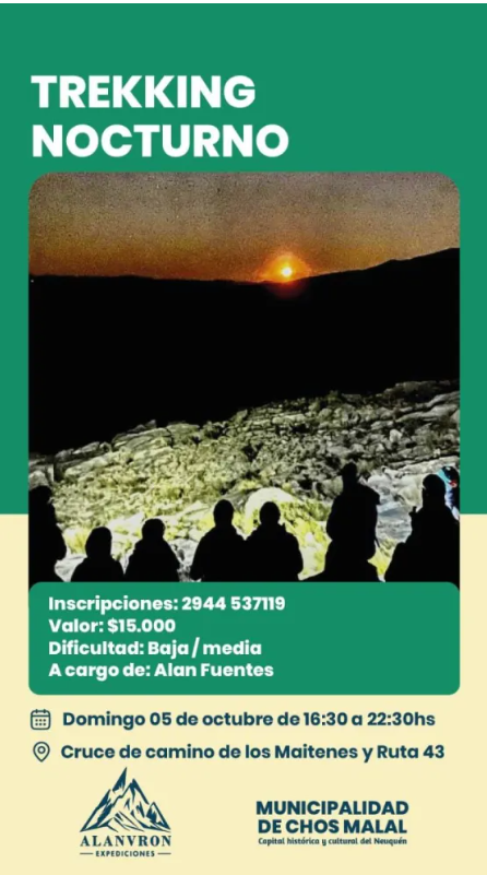 La municipalidad de Chos Malal invita a vecinos y turistas a participar de un trekking nocturno por el Cerro de la Virgen, que se realizará el próximo 5 de octubre. La actividad permitirá disfrutar del atardecer acompañado de un brindis y una picada, en un recorrido seguro y guiado.