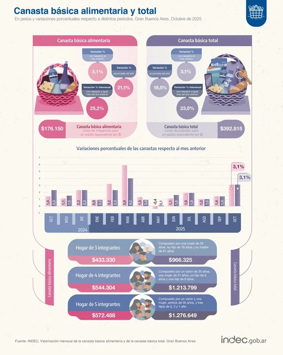 Una familia tipo necesitó $1.213.798,81 para no caer bajo la línea de pobreza en octubre, según informó el Instituto Nacional de Estadística y Censos (INDEC). El dato representa un aumento del 3,1% respecto a septiembre.