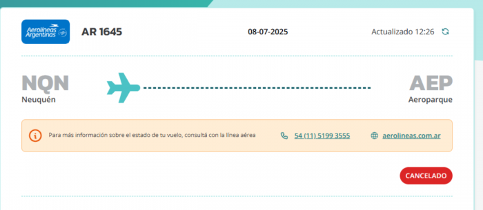 Solo el vuelo AR1645 de Aerolíneas Argentinas fue cancelado. El mismo salía desde el aeropuerto de Neuquén con destino a Aeroparque.