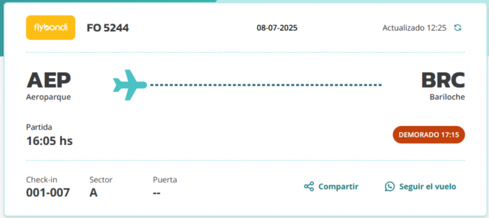 Por su parte Flybondi tiene demora en su vuelo FO5244 con destino a Bariloche. El horario de salida era a las 16:05 y fue reprogramado para las 17.15.
