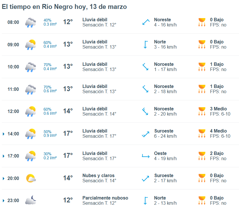 El pronóstico del tiempo para la ciudad de Río Negro, indica que hoy 13 de marzo el cielo estará parcialmente nublado por la mañana y la temperatura rondará entre 9 grados.