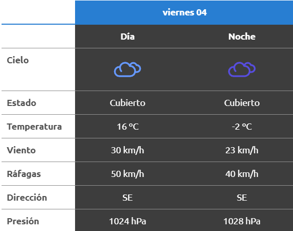 El parte del servicio meteorológico prevé que para después del mediodía el cielo estará parcialmente nublado y los vientos del sector sudeste tendrán velocidades estimadas de entre 13 y 22 km/h. La temperatura pronosticada sería de 12 grados.