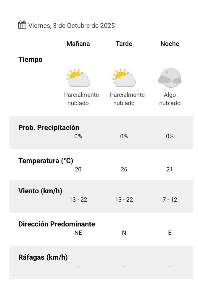 El parte del servicio meteorológico prevé que para después del mediodía el cielo estará parcialmente nublado y los vientos del sector norte tendrán velocidades estimadas entre 13 y 22 km/h. La temperatura pronosticada sería de 26 grados.