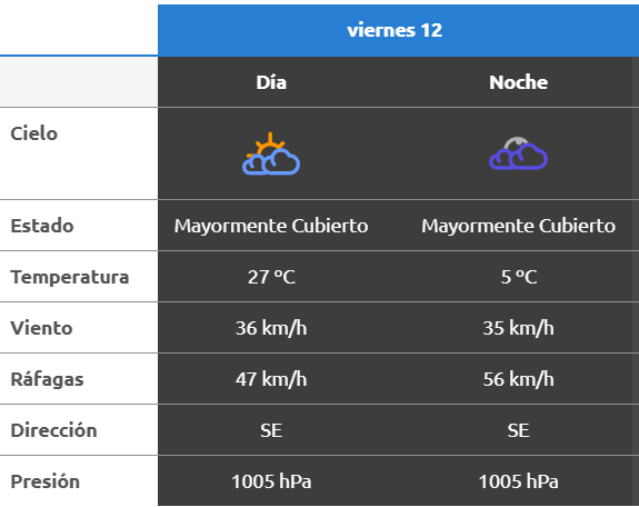 La AIC también prevé un viernes mayormente cubierto, con una máxima de 27°C, viento sostenido de 36 km/h y ráfagas cercanas a los 47 km/h. Por la noche, la nubosidad persistirá y la temperatura bajará hasta los 5°C, con viento del sudeste de hasta 56 km/h.