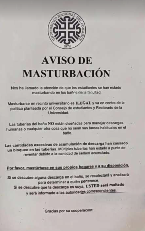 El cartel advertía sobre una práctica “íntima” en los baños de la institución, descrita como “ilegal y contraria a las normas establecidas por el Consejo de Estudiantes y el Rectorado”.