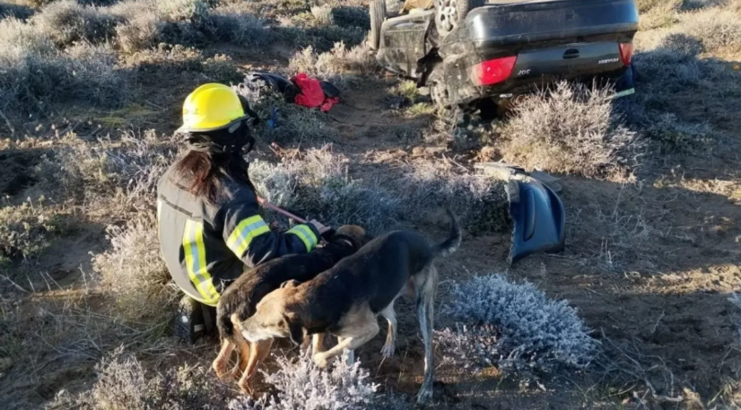 Al lugar acudieron Bomberos Voluntarios, personal policial y equipos de salud, que encontraron el auto completamente dado vuelta y a sus ocupantes atrapados junto a dos perros que viajaban con ellos.